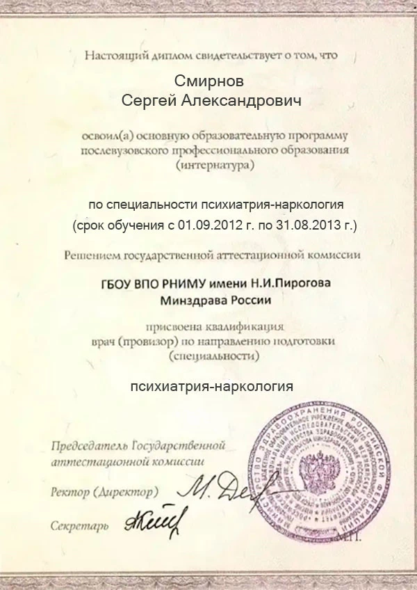 • 2013 г. — Сертификат специалиста: ГБОУ ВПО РНИМУ имени Н.И. Пирогова Минздрава России (психиатрия-наркология);
